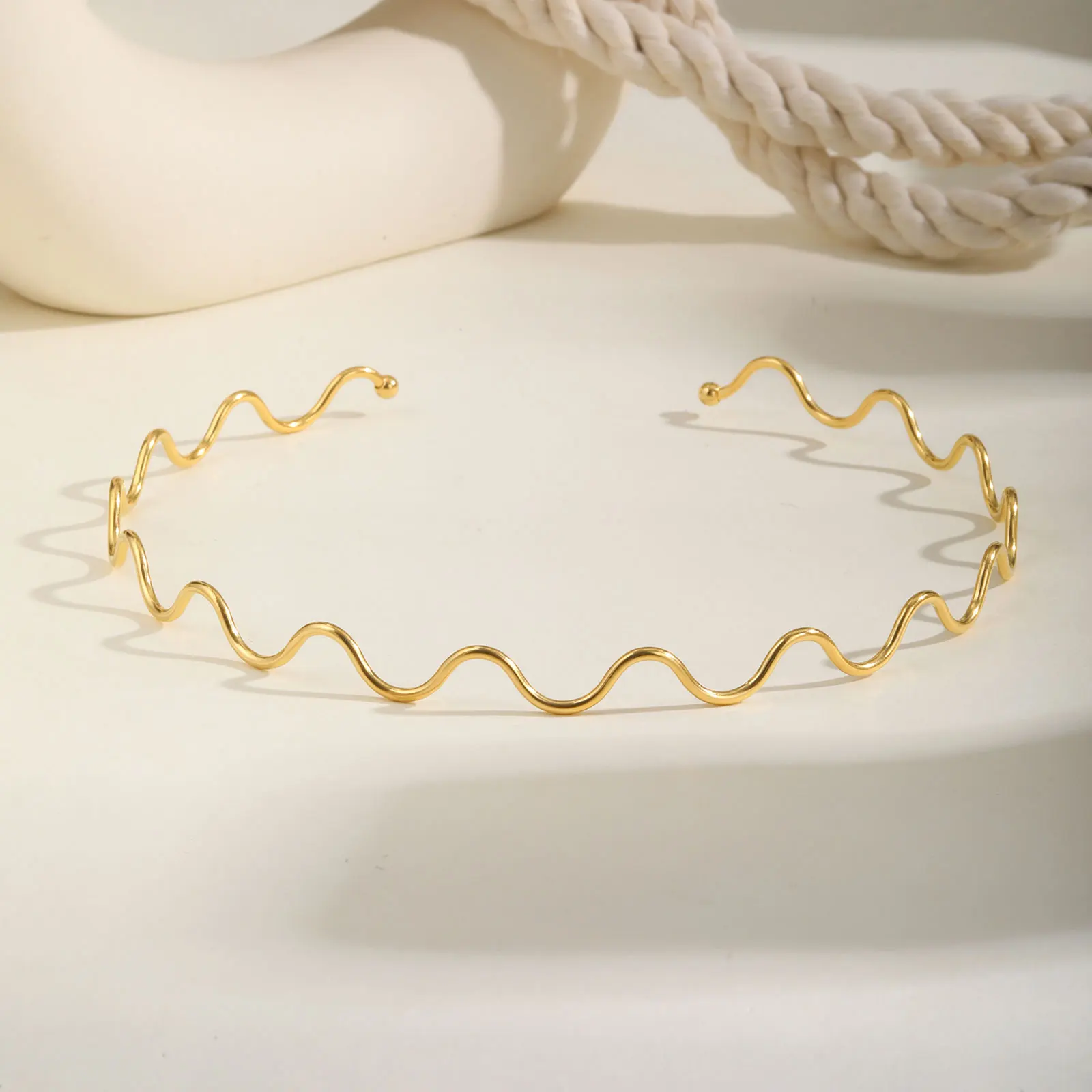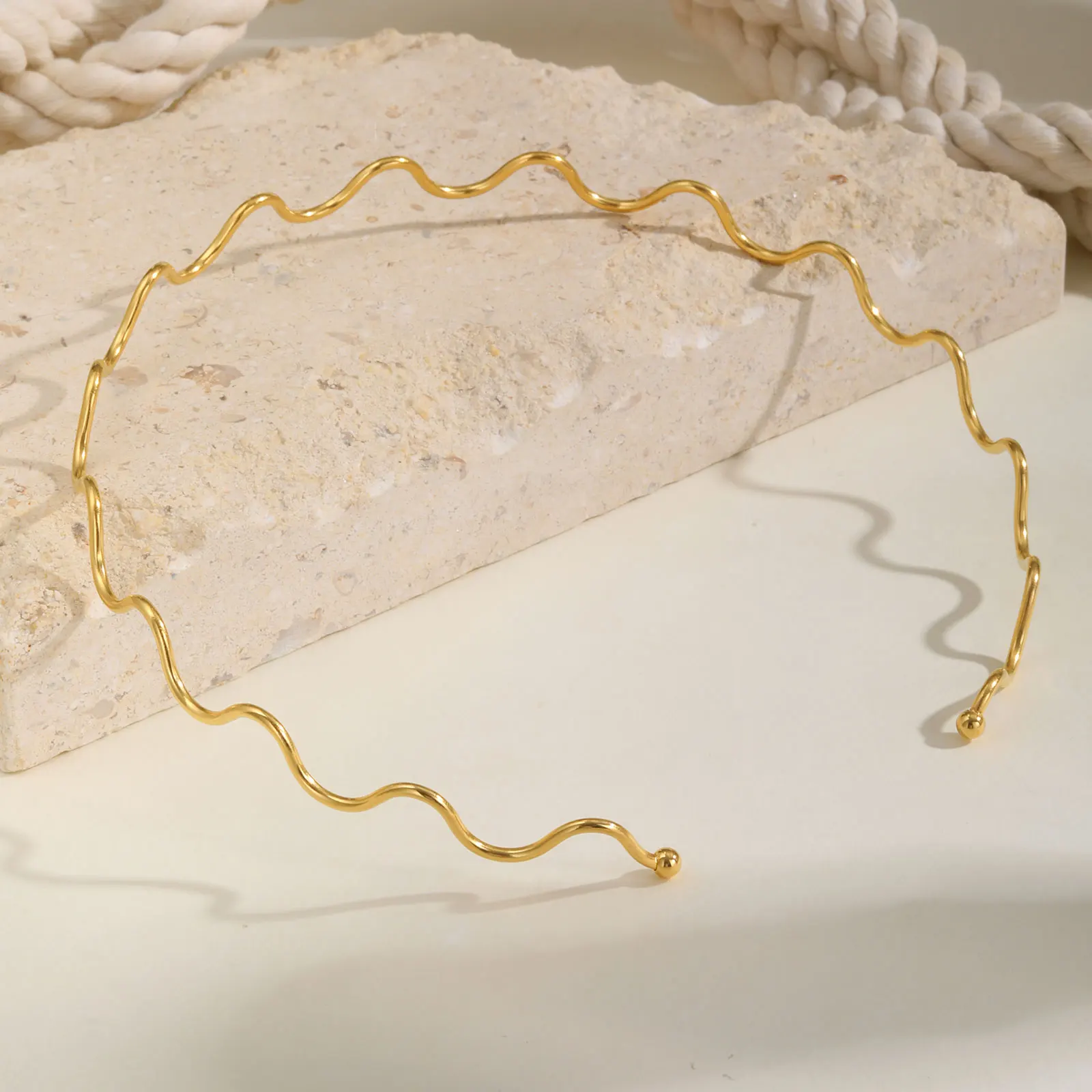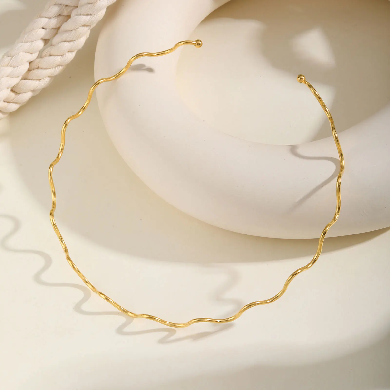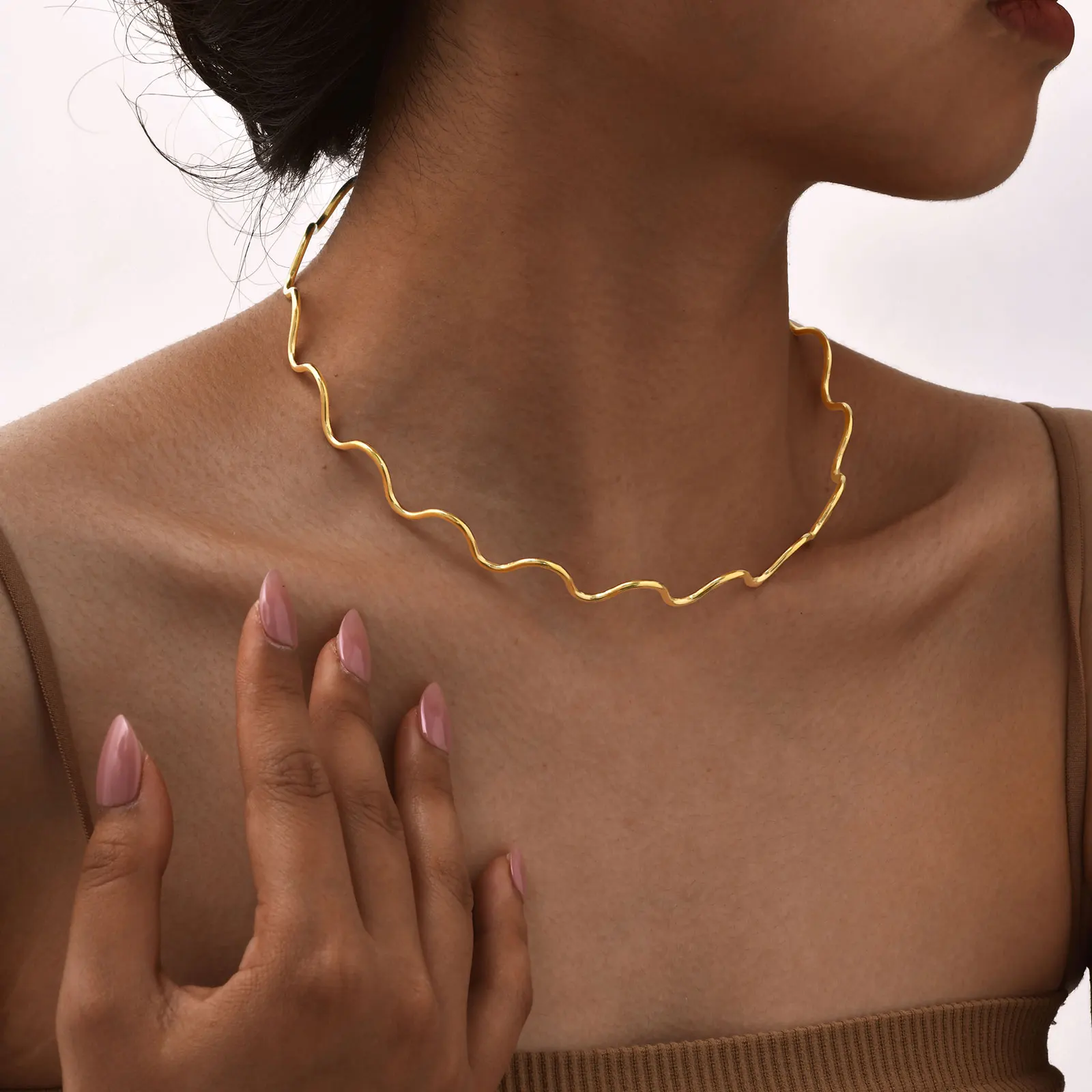 Descubra o Colar Choker Dunas Dourada, a peça que faltava para elevar seu estilo com uma sofisticação descomplicada. Inspirado nas curvas suaves das dunas e no brilho do sol, este colar é uma celebração do design minimalista e atemporal. Sua forma ondulada e fluida se ajusta delicadamente ao pescoço, adicionando um toque de arte e movimento a qualquer look. Use-o sozinho para um visual elegante e discreto ou combine-o com outras peças para criar um mix de colares que conta a sua própria história. Uma joia versátil, perfeita para o dia a dia e para ocasiões especiais.