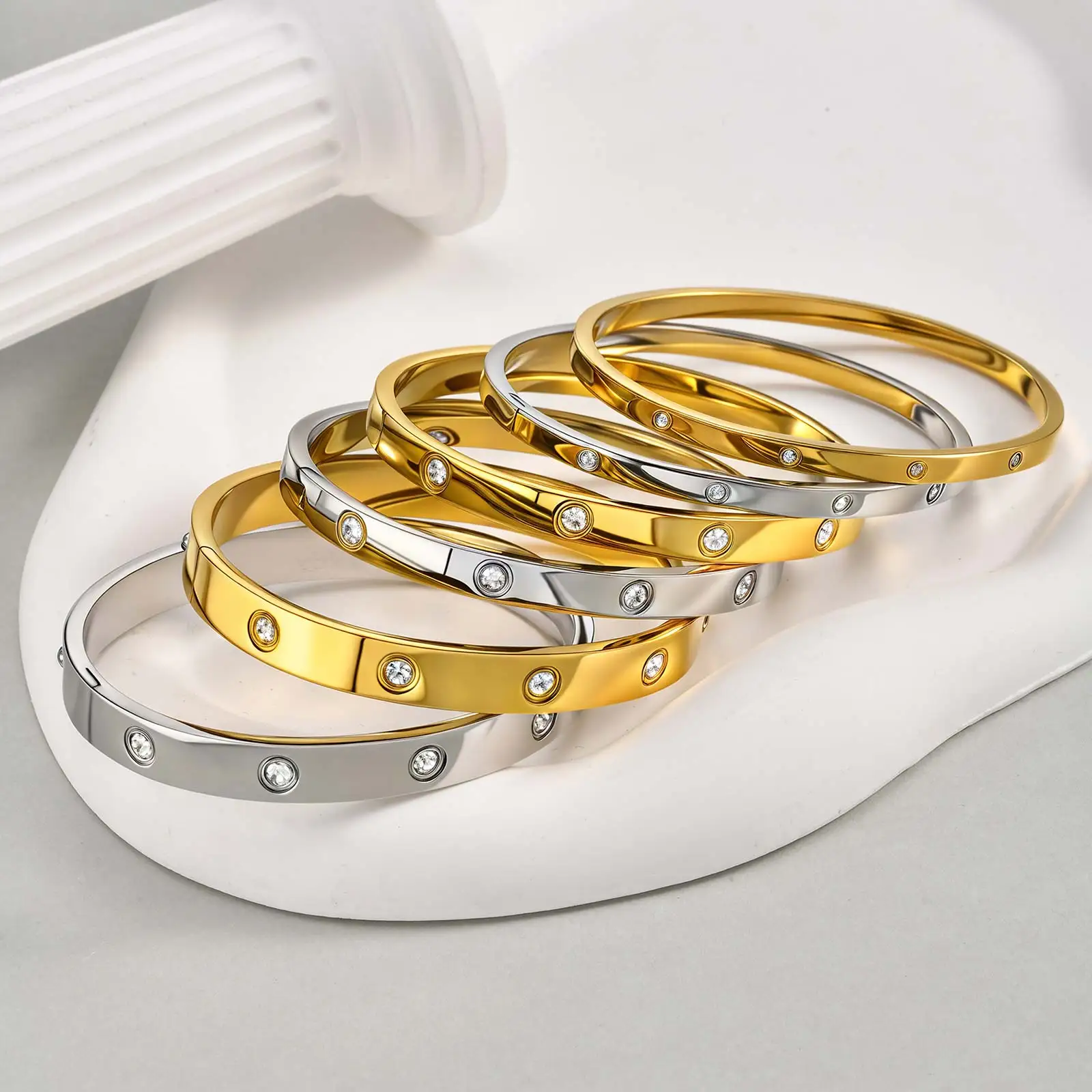 Em duas Cores: uma banhada a ouro 18k e a outra com acabamento em prata, ambas cravejadas com cristais brilhantes. O design clássico e minimalista as torna perfeitas para usar juntas, criando uma dupla cheia de personalidade, ou separadamente, para um toque sutil de brilho em qualquer ocasião.
